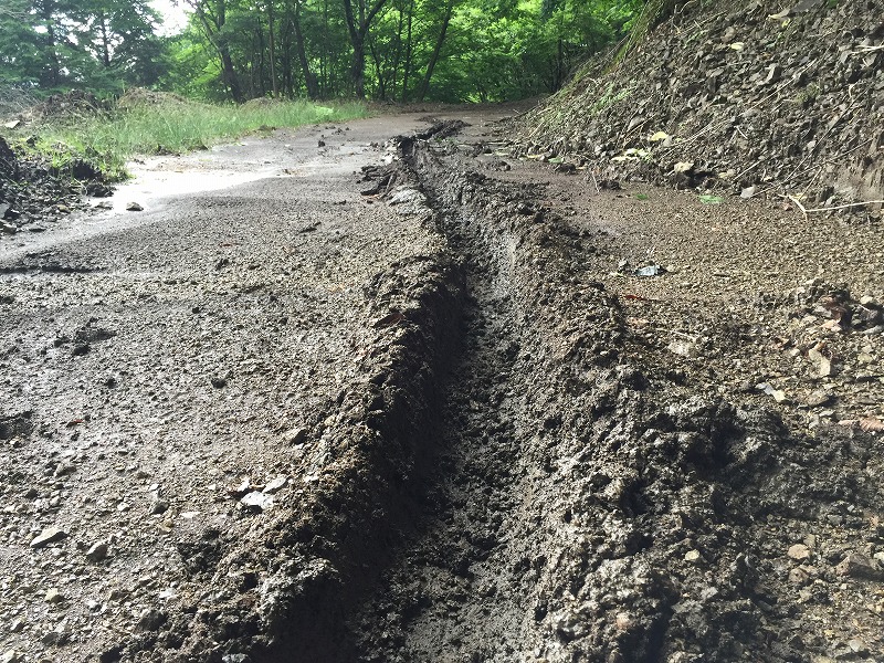 崖又山の崩落場所は台風や雨の影響でガレた上、法面と谷の間にあるのはタイヤ2、3本分の道幅。